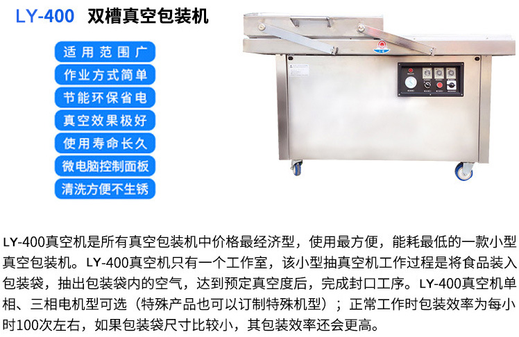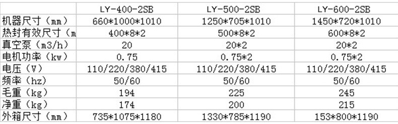| 联亿 | ly-400双室真空包装机 | 是 | 捆扎/裹包/打码/喷码/计量/封口 | 1Kw |