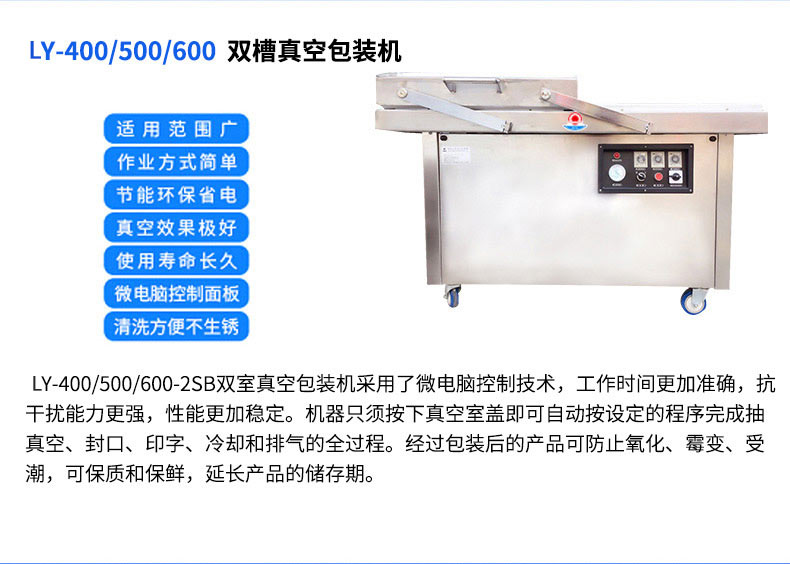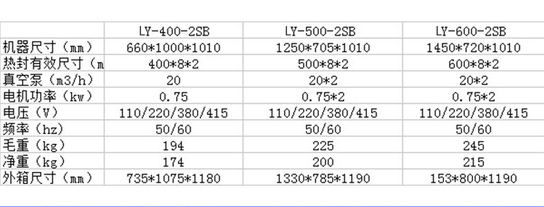 | 联亿 | LY-500双槽真空包装机 | 是 | 捆扎/裹包/打码/喷码/计量/封口 | 1Kw |